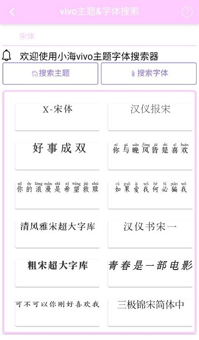 小海vivo主题字体修改器可一键快捷搜索不同主题和地址的资源库,当你在使用手机过程中如果有更换字体的需求那么不妨来试下该软件吧,可以帮助你快速找到各类风格各异的字体以及壁纸!