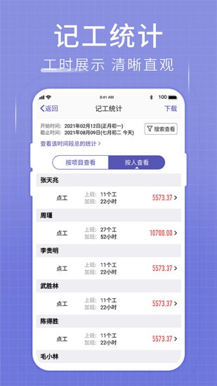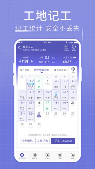 工地便捷记工:工地记工天、记工时、记加班,记工内容都很详细,点工包工都能使用;
