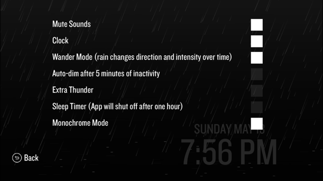 -- 变化模式:Just Rain 能够随着时间自动改变雨水的方向和强弱,声音也会随之改变。帮助您在睡眠时享受不断变化的雨声。