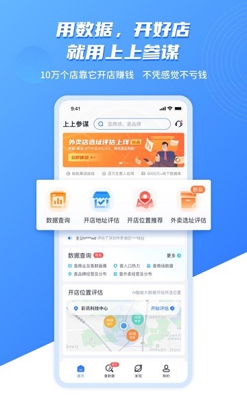 上上参谋,帮助外卖餐饮企业高效开展选址服务,软件结合开店店铺信息,智能筛选高性价比开店选址地点,软件从地区市场、区位、营收预估等多重角度智能分析,帮助店铺新手有效规避风险,提高开店营业成功率,有需要的用户可以下载使用!