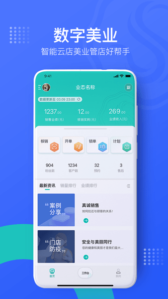 智能云店最新版是针对美业行业门店提供经营管理服务的办公平台,面向门店商家,打造数字美业掌上工作台,集核销管理、连锁管理、业绩管理、统计报表等功能为一体,数据实时记录,一目了然,开单、收银、服务、核销一体化,办公更加高效简单!