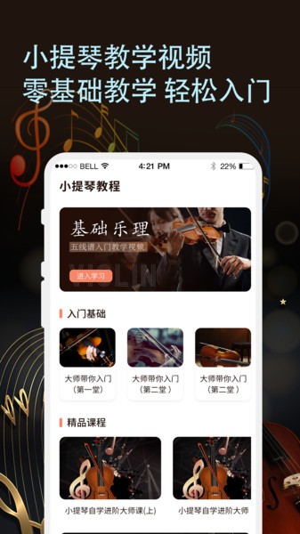 应用提供了小提琴的基础知识介绍,包括小提琴的构造、部件名称、选购指南以及保养方法等,帮助用户全面了解小提琴。