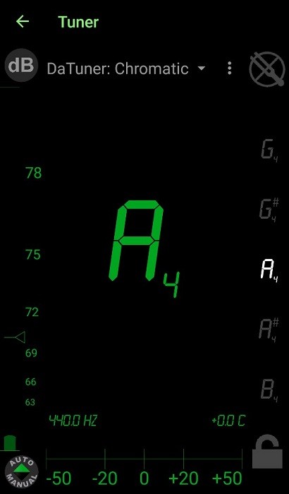 当您开始使用 DaTuner 时,您会遇到一个完全易于使用的界面,任何人都可以轻松使用。具体来说,您将看到一个轴,其参数在使用时始终运行,因为它会识别相应的声音并为您提供结果。您将像使用专用设备一样开始调整过程。此外,您将知道您提供的结果何时适合您使用的仪器。