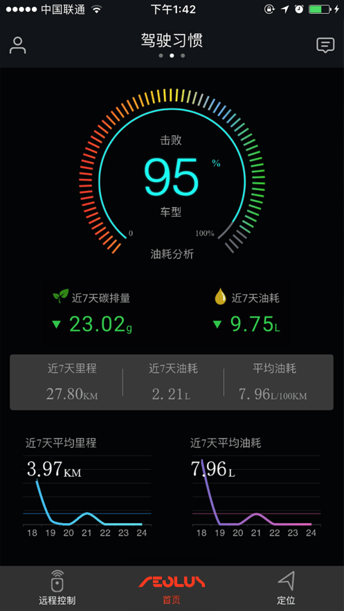 驾驶习惯统计:随时了解自己近七天的油耗和碳排量对比记录;