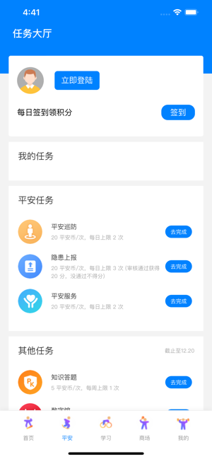 通过领取巡防任务进行巡防,完成巡防任务,并在巡防任务中进行隐患上报,从而获取平安币进行巡防排行榜的排名。巡防任务可以上传隐患图片,可以进行录音描述隐患。