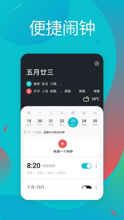 起床闹铃这个安卓软件真的挺有意思的,不仅是个简单的闹钟,还自带好多小工具,比如秒表、倒计时这些,感觉特别实用。最让我喜欢的是它的日历功能,想查什么日期随手就能看,完全不用再开别的app了。软件界面设计得很简洁,操作起来也很顺手,特别是摇手机就能换颜色这点真的很贴心,每次用的时候都感觉自己在玩科技产品。