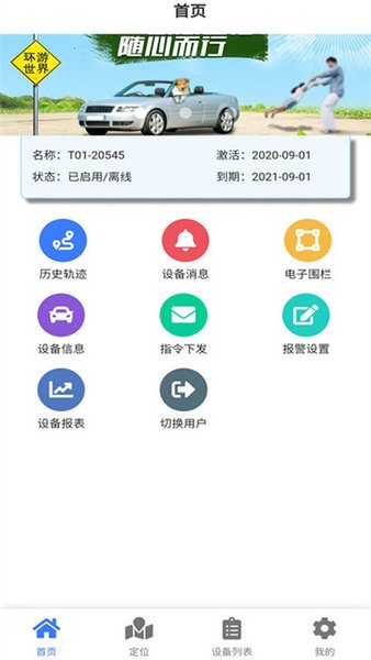 拥有丰富的功能服务应用,首页提供了设备报表、设备信息、指令下发以及电子围栏等多种工具;