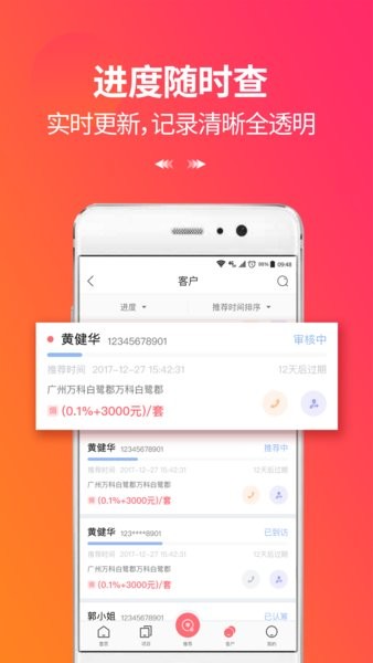 1.客户动态实时查看,推荐,到访,购买你都能在线了解,方便你的佣金最快到账。