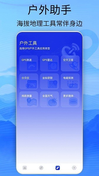 2、GPS户外工具:包括GPS测速、GPS雷达、各国卫星系统、分贝仪、坐标获取、电磁探测、线路测量、全国天气等,多工功能工具箱