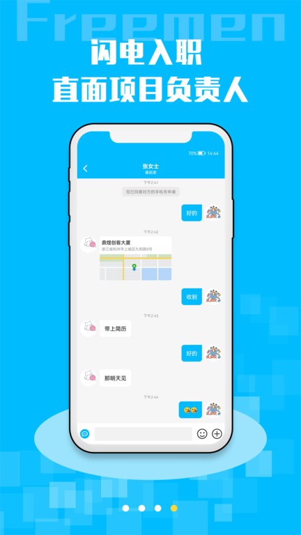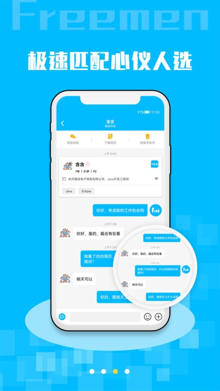 freemen招聘软件非常适合程序员找工作,这里有非常丰富的程序员招聘岗位,这里也汇集了一群技术人员,求职者可以轻松找到满意的工作,企业能够找到适合的企业人才,能够和项目负责人直接沟通。
