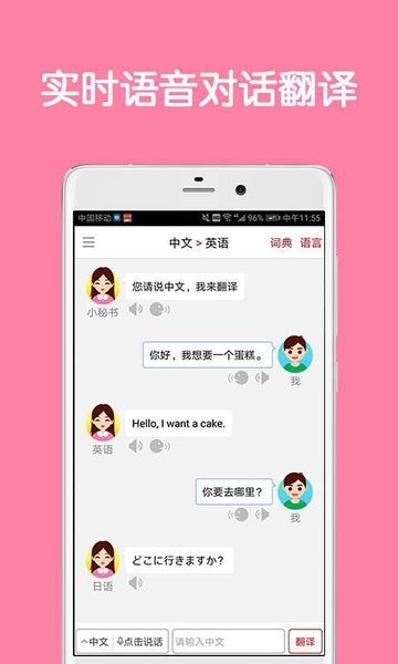 2.同声翻译:你说中文,她说英文,您输入英文她说中文,绝对是你学习英语,和老外交流OR做生意OR出国旅行,查询单词句子的强大工具。