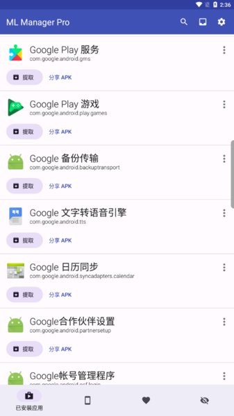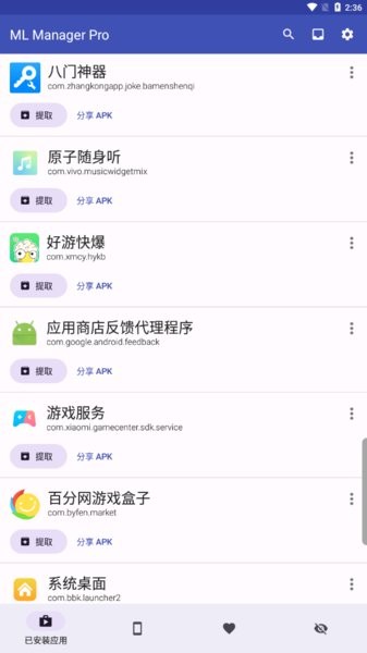 ml manager pro专业版汉化版可以用于提取手机中的apk安装包程序,只要是安装到了手机中的app,它都可以提取出来,并且可以一次同时提取多个apk。软件还可以把系统应用保存为apk格式,提取出来使用。