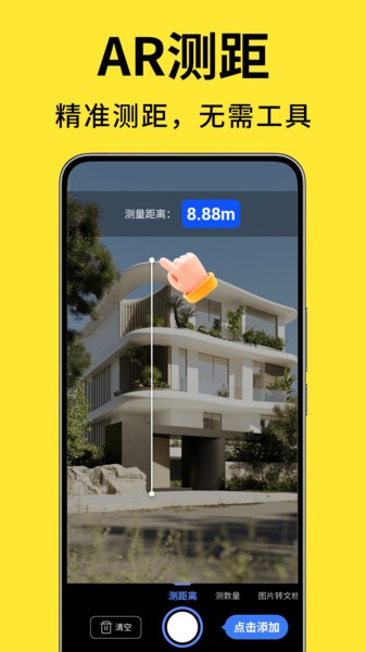 使用手机摄像头,精准对焦测量内容,左右两端连线测距离,精准识别距离,可自定义物体及扫描内容。