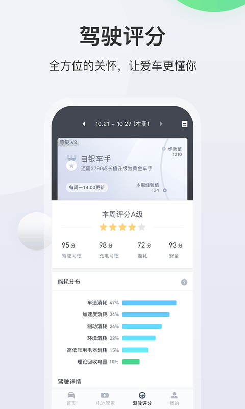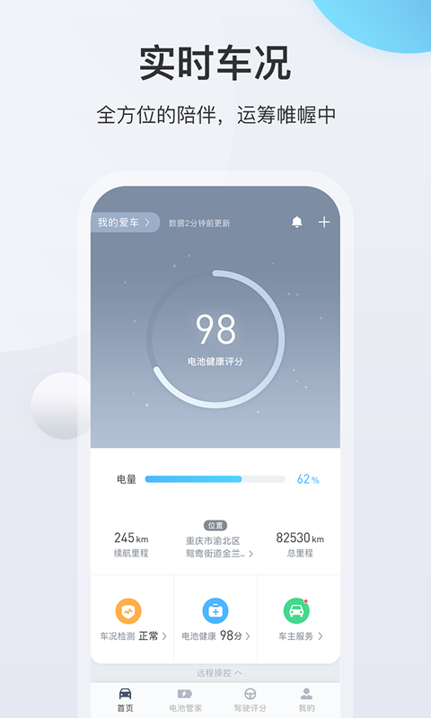 查看爱车的电池健康评分、电池详情信息和电池使用建议;预约充电、电池预约加热等功能为新能源汽车用户出行保驾护航。