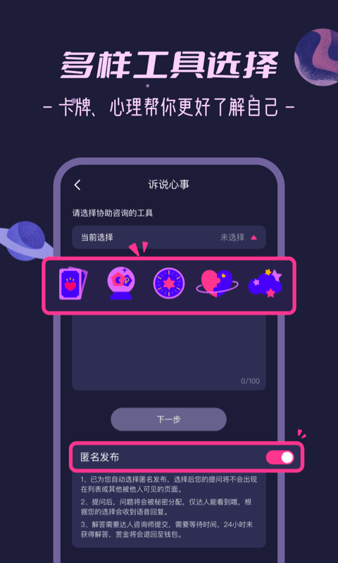 秘密花园官方版是专门提供情感咨询倾诉的应用软件,主要面向女性朋友,大家可以在这里匿名倾诉,专业导师为你解惑答疑,给你建议,提供贴心的咨询服务,聊后即毁,无痕模式,还提供卡牌、心理等工具使用,帮你更了解自己,放松身心!