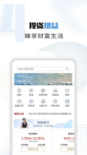 6、财富管理更专业,整合存款、理财、基金、贵金属等系列金融产品,满足多样化投资需求,帮您完美实现投资增益“小目标”。