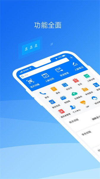 同时还提供了“人脉笔记”、“名片扫描”、“短信库”、“短信群发单显”、“礼品店”、“人脉管理”、“事务管理”、“纪念日管理”、“生日管理”、“人脉分析”、“云端备份”、“通话备忘”、“新号码提醒”、“人脉日历”、“常用电话”等实用功能,帮助用户方便的管理和维护人脉关系。