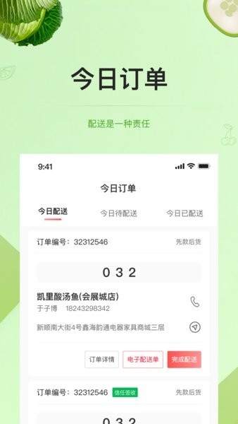 辅助配送员配送生鲜订单,提供导航、健康记录、紧急情况报备等功能,服务于配送员配送过程中的可能遇到的各种情况。