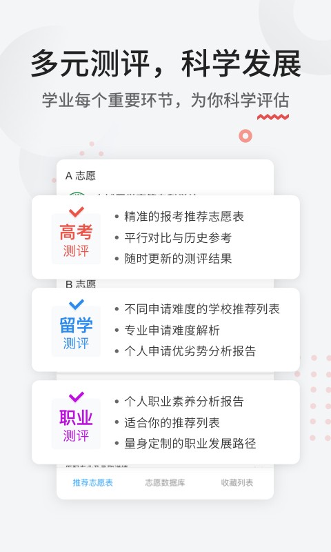 高考测评&分数线工具、留学申请测评、职业测评,帮你快速完成自我定位,锁定目标。