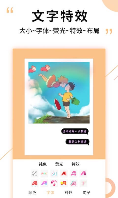 图片加文字精灵手机版是提供图片编辑制作的应用app,为用户带来丰富的素材工具,超多趣味贴纸、个性滤镜、多彩背景以及文字特效可以随你使用,在线添加,轻松制作,一键编辑处理优化,快速打造全新创意的图片效果,好用又简单!
