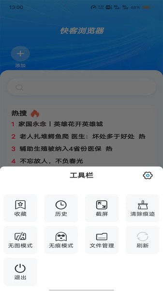 快客浏览器采用极简界面,包括体育财经、娱乐资讯、实时热点,浏览更省流量,运行流畅快速,让您高速安全上网。