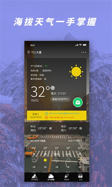 3、天气预报:一周天气预报,24小时天气预报,空气指数查看。