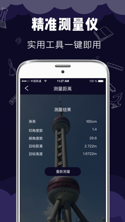输入你的身高作为参考,将靶心分别对准物体的底部和顶部拍照,即刻测出物体的高度,方便快捷。你还能测出其他人的身高