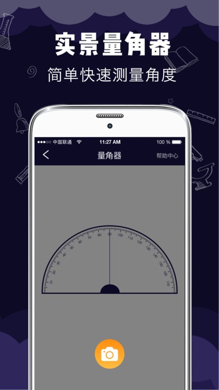 无论室内室外,当你需要量角度时,打开量角器中心对准测量订单,量角器水平线与物体水平线保持平行,滑动量角器上的参考线就能测出角度