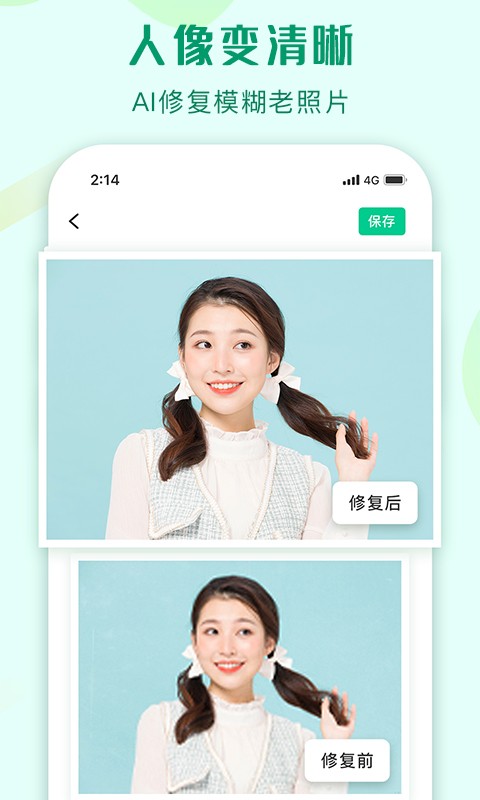自动修复,可以将模糊照片、低质照片、斑驳痕迹快速修复,一键复原高清人像。