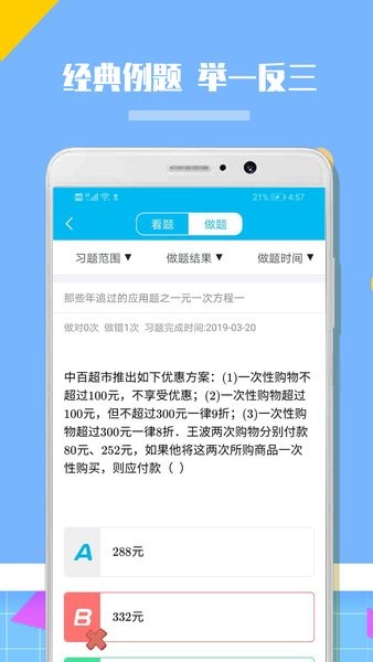 人教版初中数学app是专为初中学生们打造的一款数学学习软件,包含了初一、初二和初三的全部数学内容,专注数学考点和难点,重点题型反复讲解;通过经典题型,来让学生学会举一反三,解题思路更多样化,数学做题更清晰。