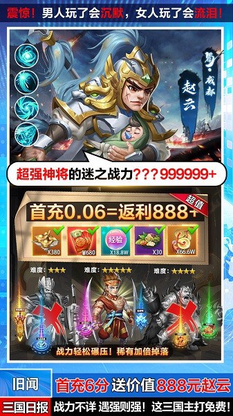 3.上线就送1000抽,你就是欧皇 开局即送五星英雄的三国卡牌策略手游《我有上将》轻松放置无限连抽,化身欧皇十连必出SSR,高颜值立绘豪华配音,沉浸式进入三国战场。 羁绊万千等你解锁,无限叠加各种技能!各类名将等你召集,更有美女武神等你领回家!日常任务福利多多,零氪也能当大哥!轻松打造不败军团,主公快来~