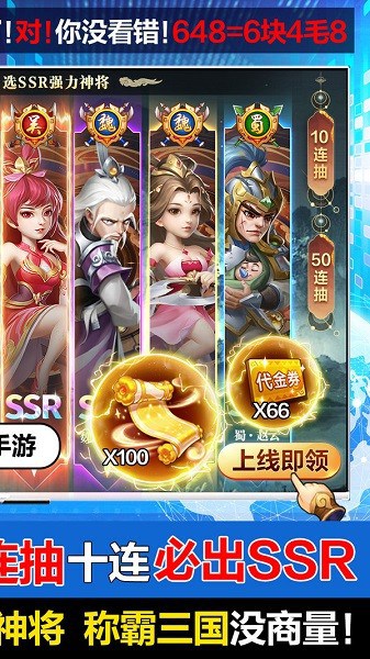 无限十连抽免费送,轻松招募英雄豪杰 美术升级精致立绘,一览三国人物魅力