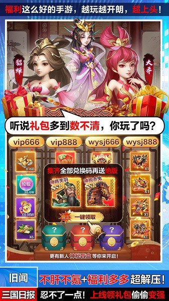 游戏里的武将种类特别多,各种三国名将都能收集,还有美女武神和萝莉御姐可以选择,阵容搭配起来挺有成就感。策略玩法也很有意思,可以自由布阵、利用阵营克制,甚至不看战力也能赢。放置玩法设计得很轻松,日常任务一键完成,养成资源也免费,零氪玩家也能玩得开心。