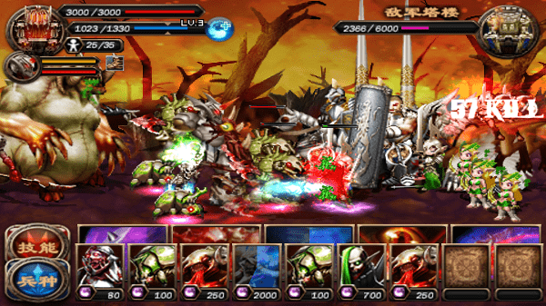 设计精美,画面华丽,可玩性非常高的横版新式塔防游戏,融合了战斗卡片,商店,技能,剧情等等各种元素;兵种主要分为不死族和联盟2大类,共有超过30个兵种单位可以生产使用:包括食尸鬼,甲虫魔鬼,毒影,女妖,骷髅剑士,民兵等等。