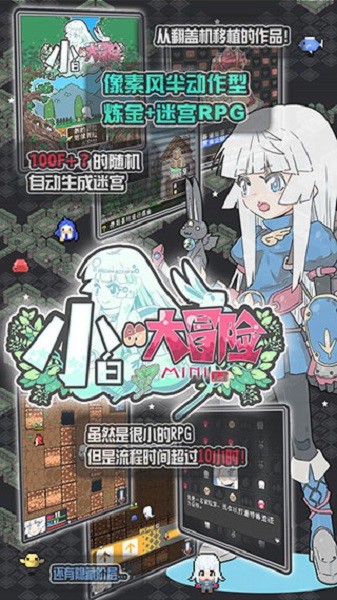 小白的大冒险mini安卓手游是由扑家工作室代理发行的一款冒险rpg游戏,采用经典像素二次元日式漫画风格的画面设计,带来趣味可爱的人物造型和场景,还提供丰富多样的系统玩法,任你探索冒险,尽情挑战,获取资源装备,自由合成升级,解锁更多地图!