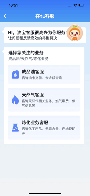 -- 持续更新车用油和家用气的常用知识、价格公示、行业资讯等内容,并为客户提供油卡充值、燃气缴费、在线客服等业务办理和咨询入口。