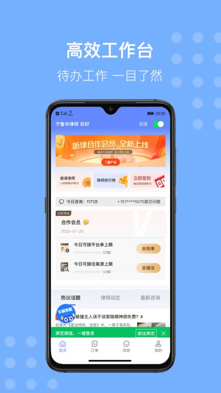 听律律师端app是一款面向律师的一站式移动办公平台,随时随地解决用户的法律问题,提高律师办公效率。