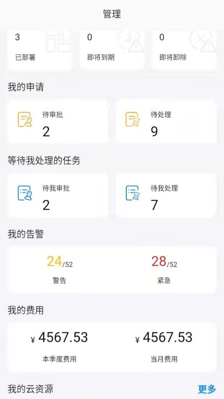 smartcmp手机版是骞云混合云管理平台app,支持在手机上查看最新的待处理任务以及申请的进度,可以查看详细的当月以及本季度费用,可以看详细的工单申请并进行接单!