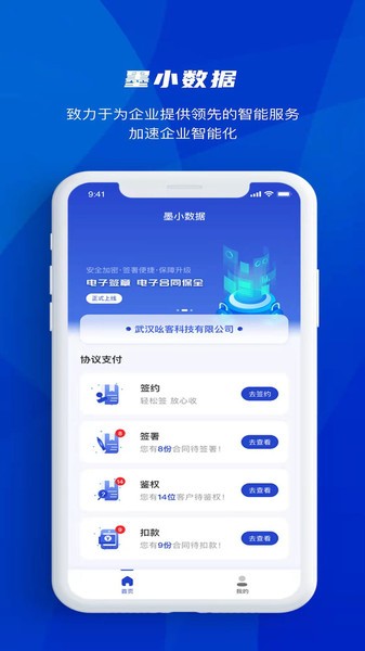 上海墨小科技数据有限公司成立于2018年10月18日,以签约+收款为开发核心,专注于一体化企业签约收款服务搭建, 为大中小型企业提供方便、快捷的签约收款解决方案。将人脸识别、电子签约、协议支付、SaaS管理系统融合到一起实现全流程线上一站式服务,帮助企业快速赋能,提升企业经营效率。
