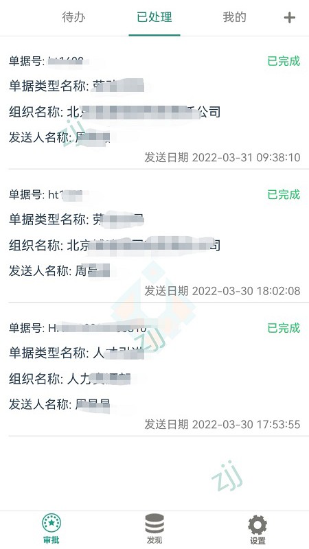 审批:可在移动端及时收到审批消息,并随时随地查看单据详细信息、单据的进度并快速的处理单据。