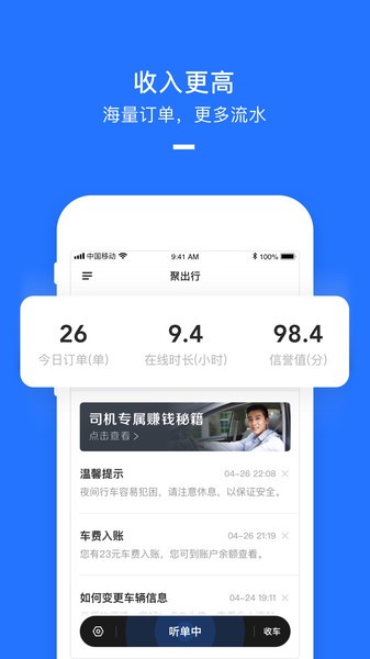 聚出行司机端app是美团专为合作的司机打造的接单抢单软件。美团的用户那不用说,肯定是很多的,所以打车订单也不会少的,司机朋友们完全不用担心没有单子跑;并且平台还可以帮忙垫付,不用担心收款问题。