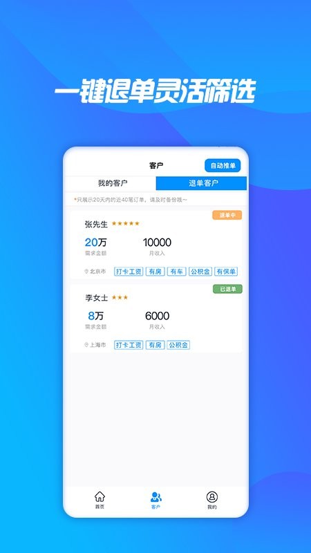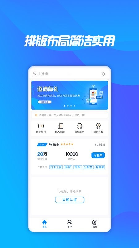 信贷经理一站式抢单获客平台,专门为信贷经理、信贷员打造的一款移动获客展业利器。助力信贷经理快速开单,降低获客成本,提高展业效率。来轻松,为成熟的信贷经理锦上添花,为新手信贷经理指明方向。