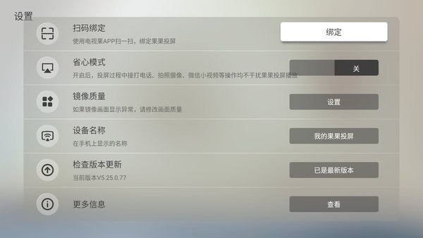 果果投屏官方版是提供投屏功能的应用工具,体积小巧,使用电视果app扫一扫,绑定果果投屏,通过手机与电视连接,轻松实现不同视频软件的投屏使用,还提供省心模式,可以自由设置镜像质量,显示设备名称,查看更多信息,操作简单易上手!