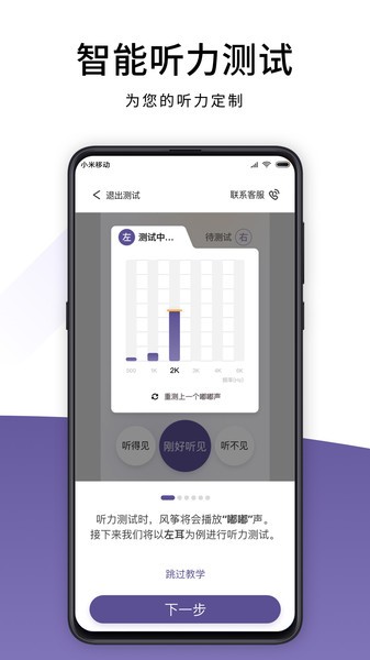 打开个性化辅听功能,您的音科思风筝辅听耳机将为您提供定制听力体验,优化缺失听损频段,还原更多声音细节。