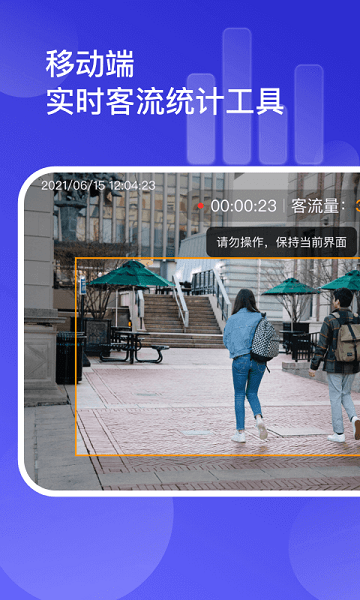 对准要统计人流量的地方架设手机,APP将实时统计进入统计范围内的人数。