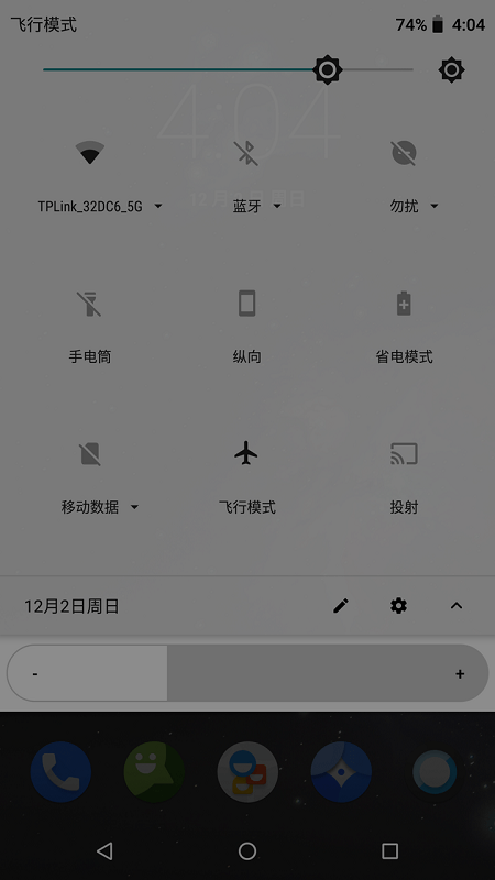 开启后在通知栏中点击+-号调节亮度,点击A按钮切自动亮度。