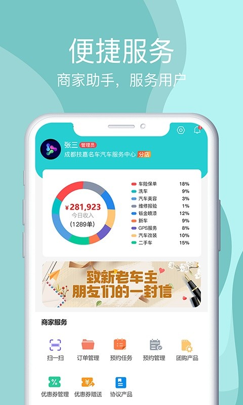 神佑商家,专为汽车商家打造的营销管理app,商家可通过app便捷设定自己的商品信息,在线处理订单信息,查看最新的汽车服务报告,统计自己的经营数据,设计合适的优惠券信息进行推广,有需要的用户可以下载使用!