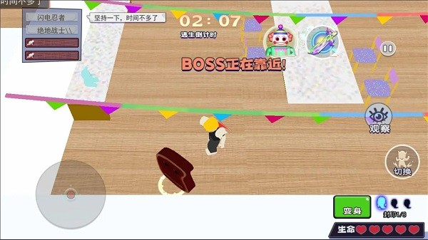 1、画面简约卡通,角色多样选择,多种道具技能变身,巧妙隐藏