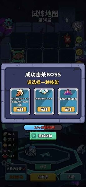 消灭完boss后随机出现3个技能,可以从中挑选一个或重新随机。