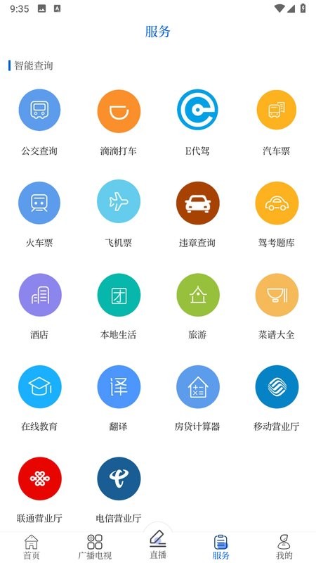 -- 服务:公交查询、火车票、飞机票、驾考题库、酒店、旅游、在线教育、营业厅等